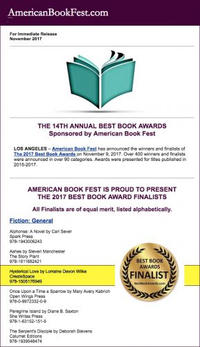| LOS ANGELES – American Book Fest has announced the winners and finalists of The 2017 Best Book Awards on November 9, 2017. Over 400 winners and finalists were announced in over 90 categories. Awards were presented for titles published in 2015-2017.