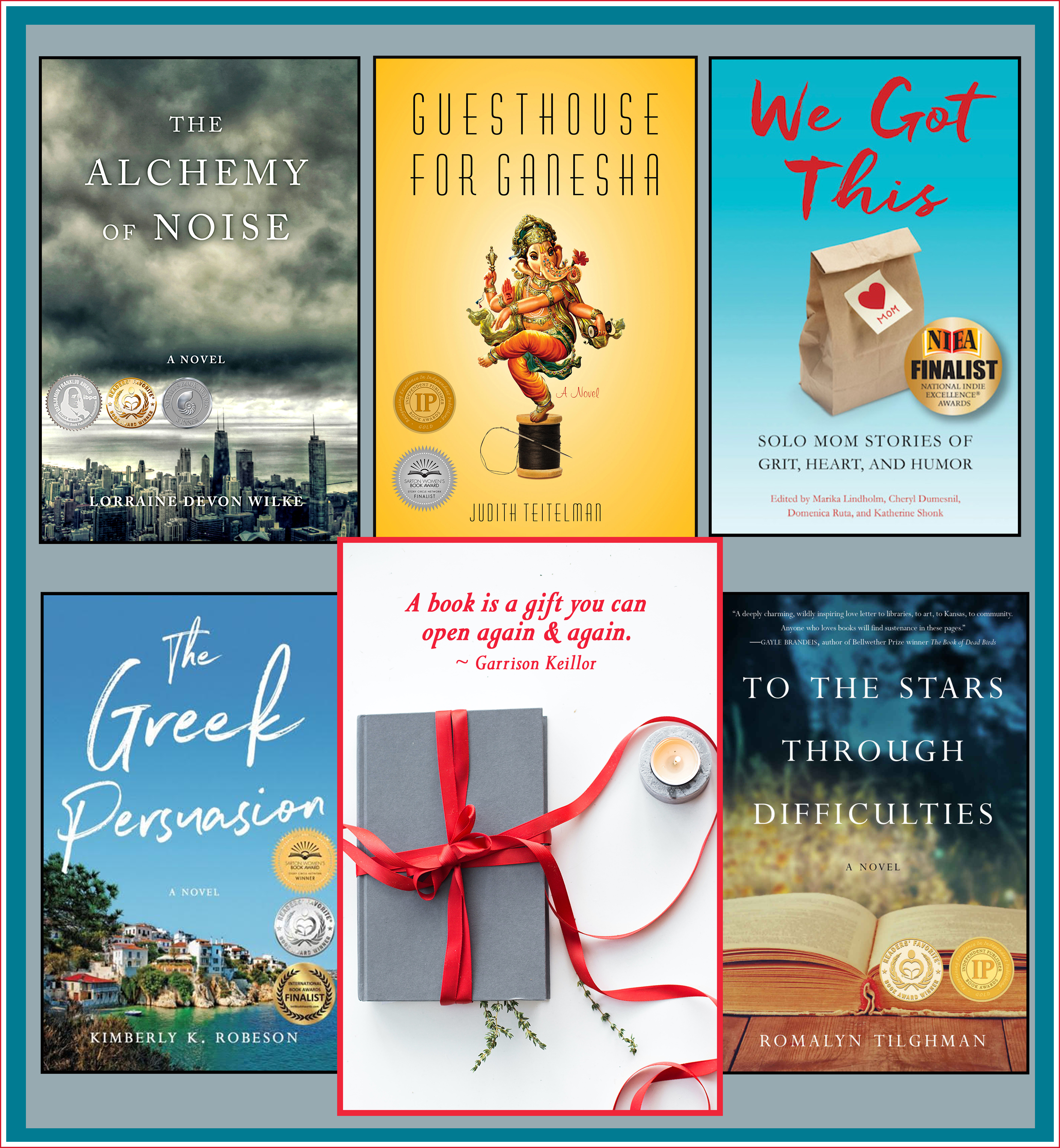 Given our respect for each other’s works, and wanting to stick with the group effort (even if, sadly, without the cool booth and fun cookie and bookmark giveaways!), we decided to do a December “Gift a Book” Event, mutually presenting all five books as gift-giving suggestions, inspired by a quote of Garrison Keillor’s:“A book is a gift you can open again and again.”