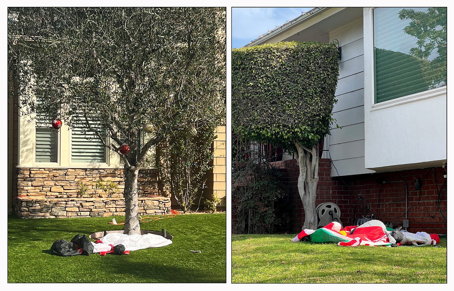 “Dearly Beloved, we are gathered here today to mourn the demise of Frosty (the Snowman), Rudolph (the Reindeer), a slew of unidentified Christmas characters, and several iterations of Santa himself, all of whom gave their last gasp sometime between yesterday and my walk this afternoon. May they rest in pieces in the front yards of friends and neighbors, reminding us of the fleeting and ephemeral nature of life itself.”