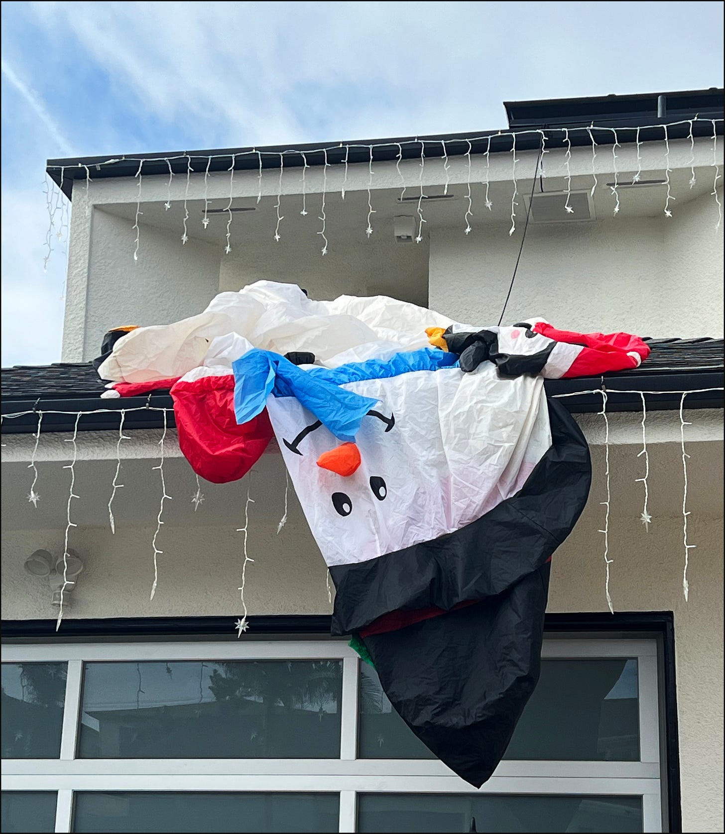 Meaning: either put that air-blower thingy on a timer, or wake up every morning prepared to make management of Rudolph, Frosty, and Santa a top—and first—priority. Get out there and make sure they’re blown-bloated before the kids wake up screaming, “Santa’s dead, Daddy, and he’s falling off the ladder!” or the neighbors glower as they speed walk past your cadre of characters wadded in a mess by the front bushes. You owe it to your family, your neighbors, certainly your inflatables, to step up. To not do so is to flout the very message of the season:
