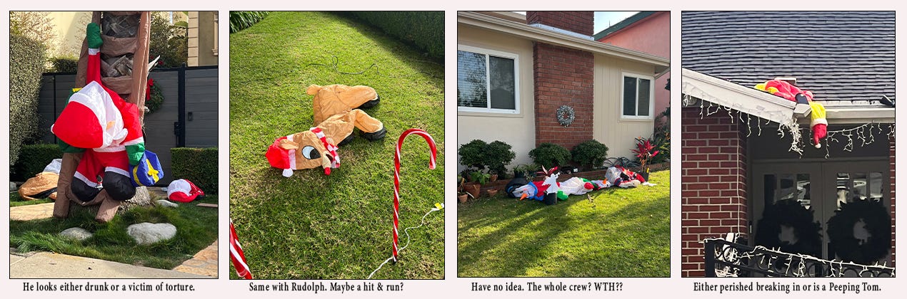 Here’s the problem: They’re not state-of-the-art decoration items. They have no actual endurance or sustainable shelf life. They’re TOYS, blow-up dolls meant to delight children who don’t give a hoot about holiday aesthetics or the soul-killing effect of deflated Santas on people fighting to stay jolly during what can be a triggering season. Kids like ‘em because they look like cartoons. Some adults like them (really?) because they look like those “hands-in-the-air” grinning tube men swaying like lunatics in front of car dealerships, who, by the way, seem to take better care of their air-filled staff than, say, the owners of these sick puppies: